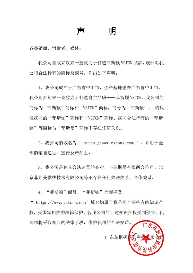 我公司自成立以來一直致力于打造菲思盾VSTON品牌,現(xiàn)針對我公司合法持有的商標(biāo)及商號,作出如下聲明: